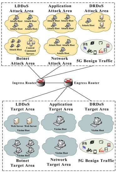 In addition, [11,12] introduced the network topology and traffic generation mode creating self-generated datasets and studied how to use attack tools to generate DDoS attacks datasets on the experimental attack and defense platform, respectively. However, the massive benign traffic is not simulated in a 5G scenario. Researchers have used many datasets [13,14,15] to evaluate the performance of their proposed intrusion detection and intrusion prevention methods. These datasets are outdated, so cannot reflect current attack types and attack methods. Therefore, collecting real datasets is a very important intrusion detection task [16].