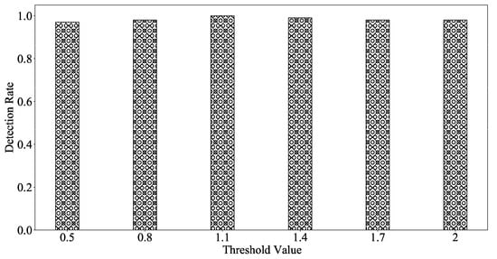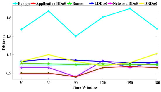 In Equation (8), t denotes the current time window, denotes average similarity in the current time window, denotes average similarity in the last time window, and denotes the estimated similarity value in the current time window. is an adjustable parameter [43]. In general, is 0.8. In Section 5.1, we use distance to measure the traffic similarity. The distance and similarity are inversely proportional. The smaller the distance, the higher the similarity, and the larger the distance, the lower the similarity. If the probability distributions and are equal, the flow distance value is small. When the two probability distributions are completely different, the flow distance value will be higher. The greater the difference between the two distributions, the smaller the distance value. When the flow distance value decreases, it indicates that there may be abnormal flow in the network. In general, the normal host can always keep communicating. Thus, the normal flow has a high distance value. When an abnormal event occurs, a large number of packets exist in the network, which can decrease the distance values. The larger the distance, the less similarity between benign and attack traffic. This property can distinguish benign traffic from attack traffic according to the flow similarity.