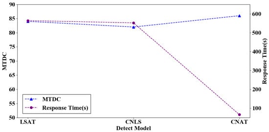 In the CNLS model, the convolutional neural network learns the features’ spatial information, but the features in the self-generated dataset have no temporal relationship, so the LSTM learns less temporal information from the features, which means that the model’s detection capability is poor. As can be seen from Figure 10, CNLS has the worst malicious traffic detection capability. The MTDC is only 82, and the response time is 552 s. The LSTM is suitable for processing time series features, but the packet payload and packet header features are spatial features, so LSTM cannot learn the comprehensive features information. However, the attention mechanism can analyze the relationship between features and labels, and assign appropriate weights to features. The model can focus on learning features according to the assigned weights, which can bring useful information to the model and eliminate the weakness that LSTM cannot fully learn features. Therefore, the LSAT model performance is second-best. The MTDC is 84, and the response time is 564 s.