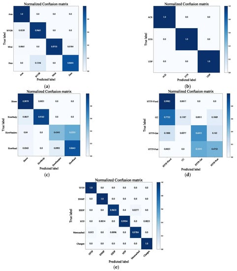 Normalized confusion matrix. (a) Botnet normalized confusion matrix; (b) Network normalized confusion matrix; (c) LDDoS normalized confusion matrix; (d) Application normalized confusion matrix; (e) DRDoS normalized confusion matrix.