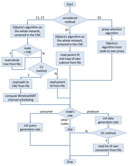 In order to conceptualize the adopted methodology, Figure 2 depicts the steps followed to implement the four analyzed methods and in particular the preliminary computation of the network settings. The top part of the figure concerns the routes computation depending on the considered method; Section 4.1 discusses in detail the adopted policies. The mechanism used in C2 to decide WirelessHART channel scheduling is discussed in Section 4.2. The bottom part of the flowchart supplies further details about settings for specific node categories.