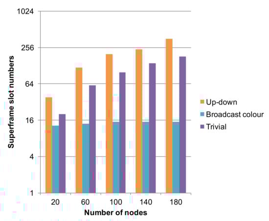 In our solution (we indicate it as em Broadcast), by contrast, a superframe is such that, for each node, there are as many slots as the number of its neighbors; e.g., node  in Figure 1 is entitled to use four blue slots in each superframe. This way, in a certain superframe, a node n may send a frame to each one of its neighbors, and parallelism between distant nodes is allowed. With this policy, the upper bound on the superframe size is , which in our networks amounts to  slots—corresponding to 200 ms—thus being independent of the network size N. The minimum superframe length is achieved when the tree degenerates to a list: in this case, three colors are enough, each node has two neighbors, and  slots per superframe are needed. Hence, latency is limited. Furthermore, this solution allows to save battery energy with respect to the choice of using one slot per color. In fact, a node stays awake for at most eight slots per superframe (four for transmission and four for reception to/from neighbors), if it owns four neighbors. As shown in Figure 3, this is seldom the case in our simulations: with 180 nodes, we obtained a superframe size of 15 slots, and the maximum node degree is 3 in the CNC-centered Dijkstra’s tree. The Broadcast solution showed a drawback with the C2 model: it supplies low latencies in uplink paths toward the CNC, while downlink paths show worse delays since up to one superframe is needed to perform one hop. For this reason, we investigated the behavior of alternative coloring policies such as those proposed in [] trying to build superframes optimized for both path traversal directions. In this case, we obtained far larger superframe sizes (as shown in Figure 2, Up-down data series), which might negatively affect latencies. Since we consider the requirements of an industrial environment, we finally resorted to use the Broadcast policy in our simulations. We modeled queues in the MAC layer as multiple FIFO queues, one for each destination, so that a node may send a frame to a neighbor as soon as a slot for that neighbor occurs, also if older frames to other neighbors exist (but in the respective, different, queue).
