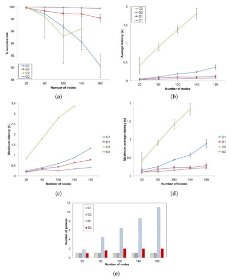In the first scenario, the number of nodes varies between 20 and 180. For all cases, both producers and consumers amount to 10% of the total number of nodes. In Figure 4a, the success rate is shown. The use of proxies in method D2 allows to maintain a success rate very close to 100%, thus indicating that the proxy selection algorithm effectively characterizes appropriate number and locations for the nodes selected to cache data items. D1 mimics quite well this behavior thanks to the proxies placed in the LCAs of the producer–consumer pairs; however, it is penalized by traffic congestion at the LCAs and along the tree branches, which causes a higher number of collisions. We recall that the paths used in D1 and D2 are different (see Section 4.1 and Figure 2): while D1 uses a CNC-centered tree, D2 uses optimal paths between producers/consumers and their proxies, thus achieving a better traffic distribution and load balancing in the network, which reduces the probability of collisions. By contrast, centralized solutions are heavily penalized with the growing number of nodes and therefore of both consumers and producers: this leads to a higher number of generated messages that converge toward the CNC. In the case of C1 (RPL in non-storing mode), an increasing number of losses due to collisions is observed as a consequence. In the case of C2 (WirelessHART), which uses time slotting, collisions do not occur. Rather, messages accumulate in the queues and are lost due to buffer overflow, while nodes wait the appropriate slot for transmitting; this effect is more evident as nodes are nearer to the CNC. This also explains the discontinuity for 100 nodes: with increasing number of nodes, the tree produced by the Dijkstra’s algorithm changes, and buffer congestion distributes differently across nodes. Results for C2 with 180 nodes are not available as the model was computationally too heavy for the simulator, which ran out of memory.