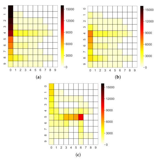 Traffic heatmaps. (a) C1 (RPL in non-storing mode); (b) D1 (RPL in storing mode); (c) D2 (proxy selection algorithm).