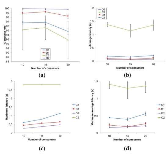 The results confirm what was observed before: while proxies in D2 allow to maintain a success rate (Figure 6a) very close to 100% (99.785% with 20 consumers), the other solutions—and in particular the centralized ones—suffer as the higher traffic, which produces either collisions (in the case of CSMA/CA), or longer queues and message drop (in the case of TDMA). The average latency, maximum latency and maximum average latency, which are shown in Figure 6b–d respectively, are in accordance to what was observed in the first scenario. This time, the network size is constant while consumers become more dense. This is why the values are almost constant, with a small decline for 15 consumers where possibly some consumer is nearer to the CNC than with 10 consumers. The D2 method succeeds in fulfilling the latency threshold with an average latency of at most 66 ms for the case of 20 consumers. As far as the maximum experimented latency is concerned, in C2 it is constant and equal to 2.8 s, determined by the consumer furthest from the CNC. By contrast, the distributed solutions achieve maximum latency of 0.62 s for D1 and 0.46 s for D2, respectively (both with 20 consumers), showing their adaptability to the positions of both producers and consumers. It is worth noting that D2, while able to guarantee an average latency comparable to the configured threshold, provides no guarantee for the performance observed by the worst consumer; hence, the maximum is largely above the threshold. The maximum latency of 0.46 s is obtained with 20 consumers, while in the first scenario the maximum latency was 0.40 s for a network of 180 nodes.