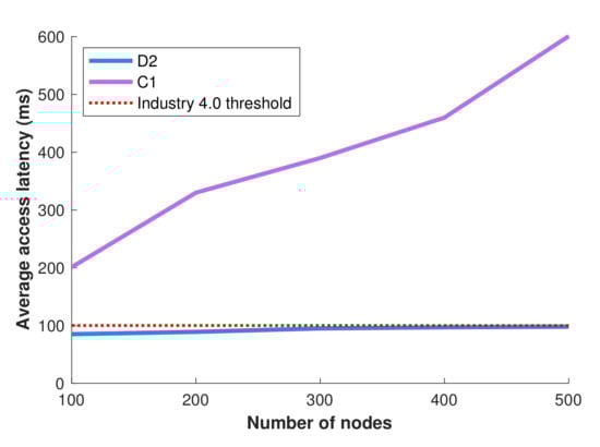 The manufacturing experimentation facility gives us an important ability to test the methods on real conditions and derive useful indications. However, at the same time, it does not allow us to perform larger-scale, or variable experiments, easily and fast. For this reason, and in order to test the scalability of smart data distribution in industrial environments, we developed a simulation model based on the manufacturing experimentation facility layouts. Figure 9 displays the results on the average data access latency for two different alternative approaches, for different numbers of nodes in the network. Specifically, the first approach is the entirely centralized approach C1 which delivers the data to the nodes requesting them through the CNC. The second approach employs our smart distributed data management D2 and uses proxies so as to distributively allocate the data across the network. The red points represent the values for the maximum latency threshold (100 ms) provided by the industrial operator. We can see that the efficient management of proxies provided by the smart data distribution process results in a better performance compared to the entirely centralized alternative. The average latency achieved by smart data distribution respects the typical Industry 4.0 constraints and always remains lower than the data access latency threshold (red line in Figure 9). This simulative result can be explained also intuitively: the dynamic proxy selection process is able to adapt to the underlying latency requirements and arrange the data distribution process in such a way that the corresponding hard constraints are respected.