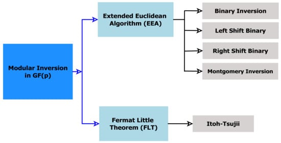 A challenge for cryptographic implementations is a modular inversion because it is one of the most time-consuming field operations in ECC computations. Computing modular inverses can be performed in a variety of ways. Using Fermat’s little (FLT) theorem, the Extended Euclidean algorithm (EEA), or any binary variant based on Montgomery’s Modular Inverse (MMI) algorithm, it is possible to compute the inverse function. Figure 1 shows the two popular methods, which are the FLT (its variation is the Itoh–Tsujii technique) and the EEA (its variations are the Binary Inversion Algorithm, Left Shift Binary Algorithm, Right Shift Binary Algorithm, and the Montgomery Inversion Algorithm) [22].