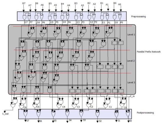 Over , carry skip (CSK), carry select (CSL), carry-save (CSA), carry-lookahead (CLA), and parallel prefix (PPF) adders are some of the fast binary adders proposed in the literature [23]. The Kogge–Stone adder (KSA) is the fastest adder in the literature because it has a lower fan-out at each stage, which then increases its performance, and is thus widely considered as a standard adder in the industry for high-performance arithmetic circuits [24]. However, it takes more area to be implemented because it computes the carries in parallel. Therefore, KSA performs parallel additions in microprocessors, DSPs, mobile devices, and other high-speed applications.