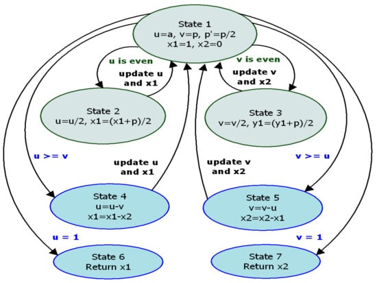 It is not difficult to determine the number of iterations (‘K’) in the worst-case scenario of Algorithm 1. In every iteration, either ‘u’ or ‘v’ are reduced by at least a factor of two, so the maximum number of iterations is , where p is a prime number of n-bit length. It follows that the minimum number of iterations is . This reveals the bounds on the exponent ‘k’ when the algorithm terminates. The functions presented in Algorithm 2 are: