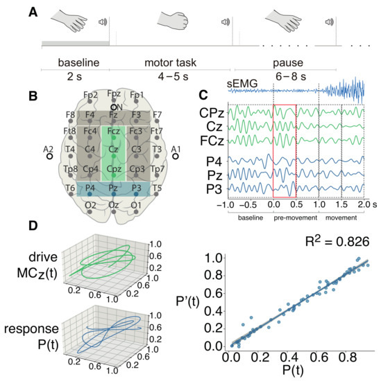 (A) The timeline of the single motor task; (B) the “10–10” international system of electrodes placement used in this study, with the areas of interest selected with colored rectangles. The green rectangle corresponds to the midline motor cortex (), and the blue area highlights the parietal lobe (); (C) an example of EEG data filtered in the theta-band (4–8 Hz). Here, functional connectivity is computed between the brain areas and P, based on multivariate EEG recordings. In the upper row, the sEMG averaged over the YA group is shown. The sEMG signal is filtered in the range of 10–100 Hz; (C) three-dimensional trajectories of subsets and P; (D) the inference of functional dependence, where is the response state and is the state predicted by the proposed FF-MLP model based on the drive state.