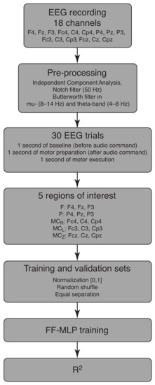 In summary, the step-by-step process of training and validation sets’ generation goes as follows. At the first step, the whole EEG recording from each of the 18 selected channels was preprocessed using ICA and a notch filter to exclude the artefacts. Then, we extracted FOIs using the Butterworth filter in FOI (mu- and theta-bands) and obtained 30 motor execution epochs for each FOI. These sets of data were united into 5 groups according to the sensor’s position on the head surface. These groups were paired as the drive state and responce state , and the purpose of the FF-MLP was to obtain an approximation of the response state to assess the functional dependence between the original states. For the FF-MLP training, the EEG data was normalized in the range (0, 1) and randomly shuffled. The final dataset was divided equally into training and validation samples and fed to FF-MLP. The results of FF-MLP was a 3D approximation of the original , which were measured with the -score to assess the quality of the approximation. This algorithm is illustrated in the block scheme in Figure 2.