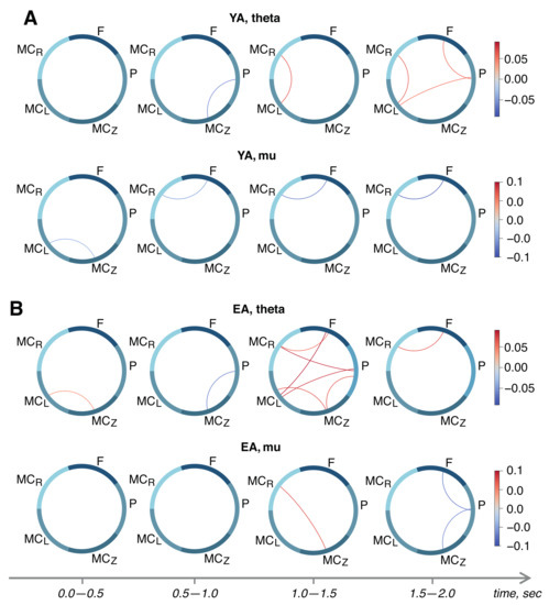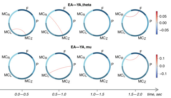 Finally, we performed between-group comparisons of -score adjacency matrices using an unpaired t-test. Results are shown in Figure 4. We demonstrated the strengthening of inter-areal task-relevant links in the EA group. In general, the couplings in the motor cortex are increased in the EA group in comparison with the YA group. In particular, the segments of the EEG associated with movement execution (1.5–2.0 s, see Figure 4) show the significant links between the frontal and right motor cortex both in the theta- and mu-bands. Moreover, in the pre-movement period (0.5–1.0 s), we observed a stronger functional dependence between the parietal and left motor cortex in the EA group in the mu-band. It should be noted that the EA group also demonstrated a stronger coupling between the parietal, frontal, and bilateral motor cortices.
