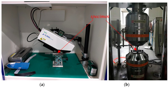 Experimental equipment: (a) μ-X360n X-ray diffractometer, residual stress measurement of specimens; (b) electro-hydraulic fatigue testing machine, tensile test of specimens. The titanium-based alloy specimens, the lower end of which is fixed on the clamping end and the upper end of which is fixed on the load end, was installed vertically on the fatigue testing machine.