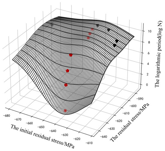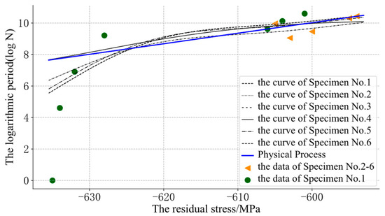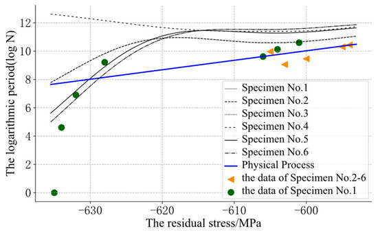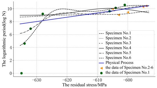 For the fatigue evolution process of metal components, the residual compressive stress can effectively improve the fatigue strength of components, and it will relax with an increase in the fatigue cycle. Therefore, the residual stress was monotonous with the cycle. In Figure 6, some curves of the GP were obviously unreasonable. The curve of specimen No. 4 showed an opposite trend to the other curves, because its initial residual stress was far from that of the other samples. The prior knowledge about “monotony” could not be integrated into the model. The model could not reasonably predict the position far away from the input data and could not guarantee its monotonicity.
