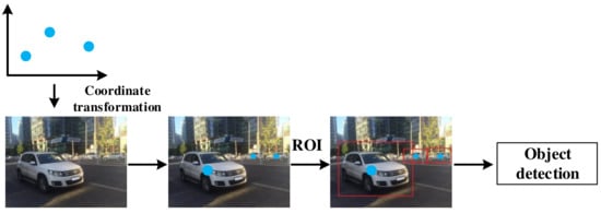 ROI is a selected area in the image, which is the focus of target detection. Compared with a pure image processing scheme, the data-level fusion scheme uses radar points to generate ROI, which can significantly improve the speed of ROI generation [42]. The size of the initial ROI is determined by the distance between the obstacle and mmWave radar [45]. The improved front-facing vehicle detection system proposed by [54] can detect overtaking with a high detection rate. This method focuses on the area where overtaking is about to occur. The overtaking is determined by checking two specific characteristics of vehicle speed and movement angle. In [55], a square with 3 meters of side length centered on the radar point is taken as the ROI.