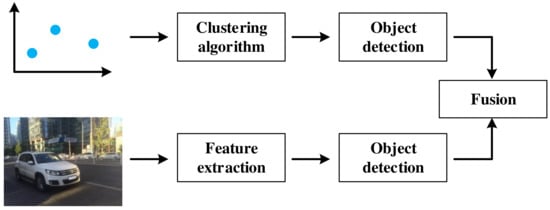 Data level fusion was a mature fusion scheme and has not been the mainstream research trend at present. However, its idea of fusing different sensor information is still useful for reference. As shown in Table 5, data level fusion first generates the region of interest (ROI) based on radar points [42,45,54,55]. The corresponding region of the vision image is then extracted according to the ROI. Finally, feature extractor and classifier are used to perform object detection on these images [45,47,53,55,56,57,58,59,60,61]. Some literatures use neural networks for object detection and classification [61,62]. For data level fusion, the number of effective radar points has a direct impact on the final detection results. If there is no radar point in a certain part of the image, this part will be ignored. This scheme narrows the searching space for object detection, saves computational resources, and leaves a hidden security danger at the same time. The data level fusion process is shown in Figure 4.