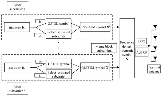 Then, is mapped to K blocks to reconstruct the GSTFIM symbol. For the k-th block subcarriers, the corresponding carrier indices are , where . Thus, for the k-th block subcarriers, the indices of the maximum value of the GSTSK symbol are expressed as