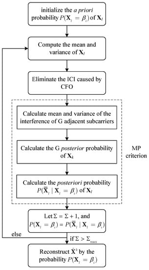 In this section, the MP-based [27,28,29,30] detectors as shown in Figure 2 are proposed to achieve a better performance. According to the CFO model in (11), the receiver symbol can be regarded as the sum of G adjacent symbols of the l-th subcarrier, where . In other words, for the k-th subcarrier, its transmitter symbol has come out G times. Thus, these G CFO models (11) can be considered as a diversity model of . Assume that index h, which represents one of these G adjacent subcarriers around subcarrier k, satisfies the condition of . Thus these diversity models of can be described by (28).
