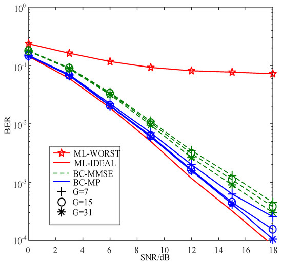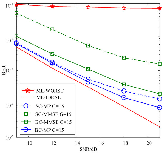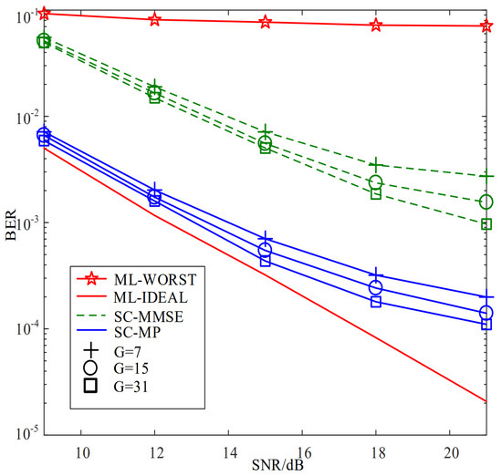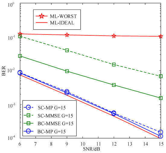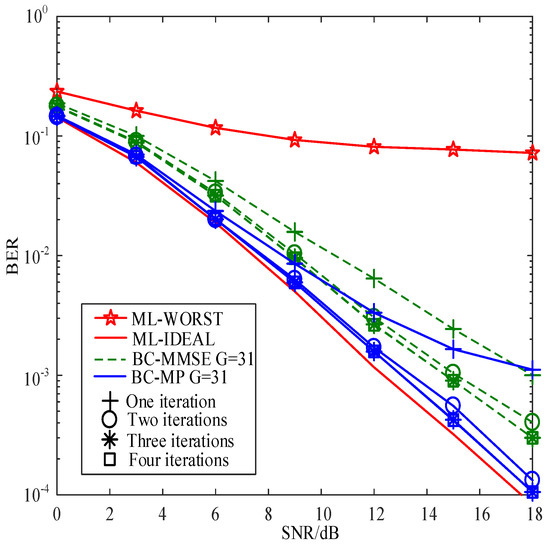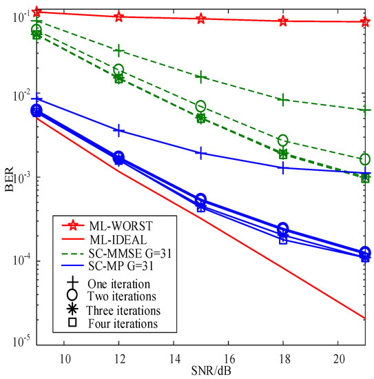 Figure 3 compares the BERs of the proposed SC-MMSE and SC-MP detectors for the GSTFIM system with different numbers of iterations, while Figure 3 compares the BERs of the proposed BC-MMSE and BC-MP detectors. The specific GSFTIM system parameters in Figure 3 and Figure 4 are as follows: , and . The CFOs and are independent and random from frame to frame following a uniform distribution over the range −0.2 to 0.2, and the length of the CP is 32. As can be observed from Figure 3 and Figure 4, the performances of the proposed four detectors are converged in three iterations. Moreover, the convergence behaviors of the proposed SC-MP and BC-MP detectors are similar to that of the ML-IDEAL detector. Meanwhile, Figure 5 compares the BERs of the proposed SC-MMSE detectors for the GSTFIM system with four iterations under different Gaussian noise types, i.e., Gaussian noise and non-Gaussian noise. The specific GSFTIM system parameters in Figure 5 are same as those in Figure 3. As can be seen from Figure 5, under non-Gaussian noise, the proposed MMSE-criterion-based detector exhibits worse performance. In this situation, the maximum-correntropy-based detector can slightly improve the BER performance. However, the performance is still much worse than that under Gaussian noise. This is mainly because there is a deviation in the calculation of the mean and variance of under non-Gaussian noise, resulting in the inaccurate calculation of the posterior probability.