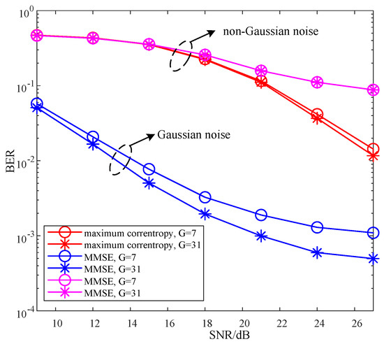 In general, the proposed MMSE detector is only suitable for the situation of Gaussian noise. Under non-Gaussian noise, the calculation of the mean and variance of will be inaccurate, resulting in the inaccurate calculation of the subsequent posterior probability. In that case, we could substitute the MMSE criterion in Step 4 by the maximum correntropy criterion [26] to mitigate the inaccuracies. The correntropy between , with joint distribution is defined as
