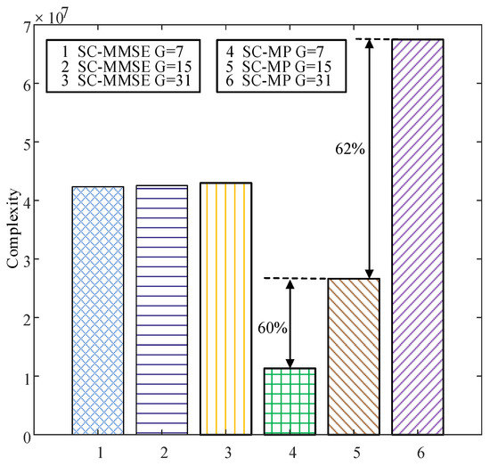 Complexity comparisons of the proposed SC-MMSE and SC-MP detectors for the GSTFIM systems with different numbers of effective subcarriers G in three iterations.