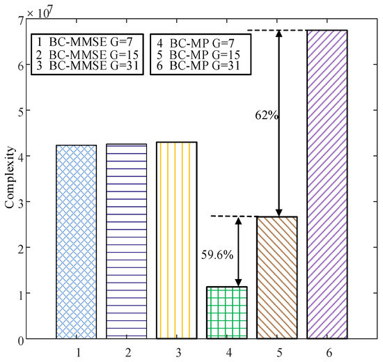 Complexity comparisons of the proposed BC-MMSE and BC-MP detectors for the GSTFIM systems with different numbers of effective subcarriers G in three iterations.