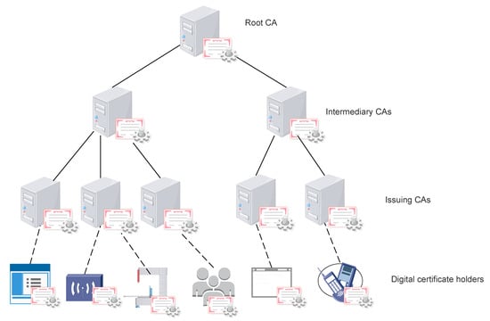 Apart from the issues associated with the hardware limitations of the IIoT devices to be protected, the use of digital certificates and public key cryptography also entails problems inherent to the centralized nature of the currently used Public Key Infrastructures (PKI). On the one hand, traditional Certification Authority (CA)-based centralized PKIs are subject to lack of trust suspicions. As it will be explained in depth in Section 5, in the current hierarchical CA architecture, based on a tree structure as depicted in Figure 1, the security of the whole system depends on the security of the high-level CAs. Therefore, if any element of the tree is compromised, the rest of the branches hanging from the compromised element are automatically compromised too. Security vulnerabilities can be of a technical nature, such as in the case of malicious attacks or sloppy configurations, but they can also be the result of organizations controlling CAs wanting to snoop into citizens’ communications. On the other hand, the expected massive deployment of IIoT devices raises new challenges for the current centralized CA architectures which will struggle to support all these new devices.