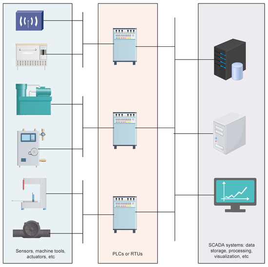 Overall, industrial communication networks are mainly based on Supervisory Control and Data Acquisition (SCADA) systems aimed at controlling industrial processes by monitoring, gathering and processing real-time data. SCADA systems consist of software and hardware elements where usually Programmable Logic Controllers (PLCs) or Remote Terminal Units (RTUs) communicate with a set of elements deployed in the industrial plant, such as machine tools, sensors, actuators, etc. The PLCs and RTUs implement SCADA software to route the information gathered from these elements to computers running SCADA software, which processes and displays the data in a way that is easily understandable by human operators and helps them to make important decisions. Figure 2 shows the overall architecture of a SCADA system.