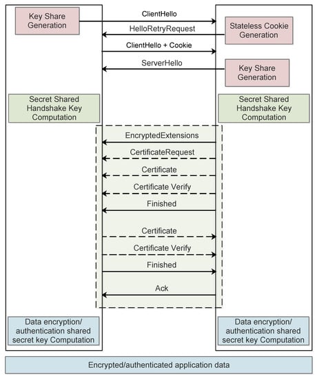 DTLS follows the same structure as TLS and it is also based on a two-layer architecture, with two main protocols: the DTLS handshake protocol and the DTLS record protocol. The handshake protocol provides mutual authentication as well as mechanisms for the negotiation of security settings and cryptographic keys. Then, the DTLS record protocol makes use of the cryptographic suites and material negotiated in the handshake phase to encrypt and authenticate, by means of Message Authentication Codes (MACs), individual packets. Figure 3 shows the DTLS 1.3 handshake exchange in which mutual authentication is achieved by means of digital certificates and a mechanism based on Diffie–Hellman is used for key exchange.