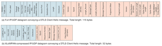 IP/UDP packet conveying a ClientHello message: (a) uncompressed, (b) compressed following the 6LoWPAN strategy.
