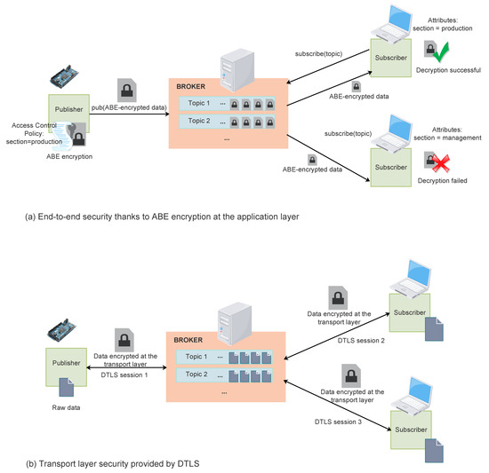 In fact, ABE is a particular type of asymmetric encryption schema where public/private key pairs are not randomly generated. Instead, the public key is specifically defined according to a policy or attribute set. Then, multiple private keys are generated that would decrypt the corresponding public key, one for each of the intended recipients of the confidential communication. Therefore, ABE is an encryption mechanism that suits the characteristics of brokered communications in industrial scenarios: it removes the necessity of maintaining a centralized PKI hierarchy and it allows including an access policy in the encrypted data, so that the same encrypted data can be decrypted by multiple destinations that match the access policy.