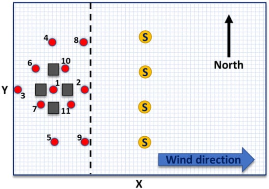 Here, the test site was a flat (1225 m × 850 m) area with eleven possible leaks and four (50 m wide, 50 m long, 20 m high) buildings. The gas concentration was computed in 833 receptors evenly spread 3 m above ground level, creating a 25 m × 50 m grid. The test site is depicted in Figure 1, and the computational specifics of the gas dispersion model are listed in Table A1 in Appendix A.
