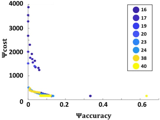 Figure 3 shows an example of the Pareto frontier obtained when source #5 was leaking at a rate of 2.5 kg/s. This computation was repeated 500 times. Figure 3 presents feasible solutions from all of these runs. Feasible solutions obtained at different distances are marked in different colors. Note that the distances are given in grid units (gu); to convert to actual distances, multiply by 50 m/gu. As expected, there was a tradeoff between accuracy and cost. Achieving more than 1% accuracy came at the cost of a relatively low sensor at distances as high as 38 gu. Zooming in to the high accuracy region of the graph shows that decreasing the distance increased both accuracy and cost by a factor ~3–6 (see Figure A1 in Appendix B). The tradeoff between the sensor array distance and cost was also examined. Figure 4 presents the detector array cost and DR distributions at different distances for all feasible solutions. It shows that deploying the detector array close to the fence in some cases resulted in a steep rise in cost. However, these expensive configurations also provided higher accuracies. The increase stemmed from the fact that when nearer the source, the variations in the gas concentration were higher than at distances farther away, where the gas plume had expanded.