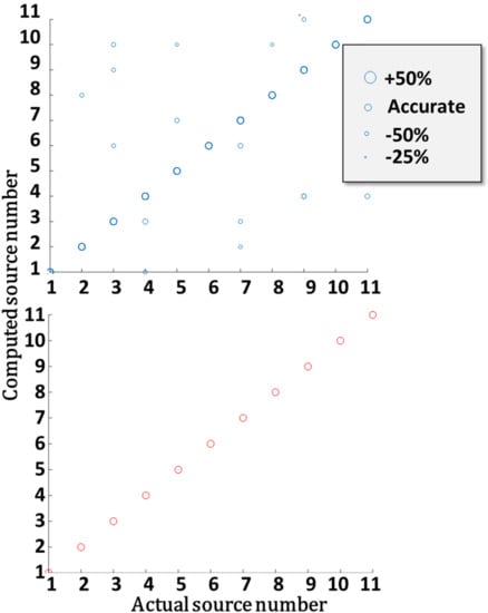 For this detector array, the MDL and DR were set to 3 kg/m3 and 10, respectively. Computations were performed with 16–17 detectors placed at a distance of 20 to 44 grid units from the industrial site fence. The performance of this array was tested for all possible cases in which one source was leaking (at a leak rate of 2.5 kg/s). For each case, the computation was repeated 50 times. The upper part of Figure 4 shows a scatterplot of the computed source locations (1–11) as compared to the actual one for all feasible solutions. The circle size indicates the discrepancy between the computed and actual leak rates. Solutions for which the leak rate was underestimated are marked with smaller circles and overestimation with larger circles. About 97% of the feasible solutions accurately estimated the leak source locations and rate; hence, the symbols in the figure overlap. These solutions fall on the diagonal of the figure. However, some feasible solutions wrongly identified the leak source and rate. The bottom part of Figure 5 shows that focusing on the 5% most accurate feasible solutions (T5) resulted in a reliable leak rate and location determination. Note that selecting the T5 solutions required choosing the solution having the lowest computed values but did not require any prior information on the problem, which indeed may be unavailable in actual cases.