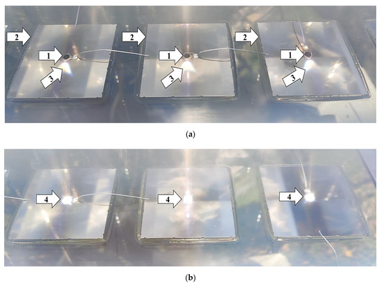 Illustration of the accuracy of solar tracking by using CPV technology (Image (a): (1) solar cell, Ø = 3 mm; (2) heat sink; (3) direct, focused solar radiation (focal point [61]) set incorrectly; Image (b): (4) direct, focused solar radiation (focal point [61]) set precisely).