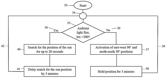 - Without an anemometer, it is possible to significantly reduce the damaging effects of strong winds during a storm as a result of setting the modules into an Equator-facing position with a tilt angle of 30° (0° azimuth and 30° tilt angle in the northern hemisphere). In comparison, in the case of an eastern or western tilt angle of more than 50°, the modules practically catch the wind just like sails and, in case of weaker mechanics, their support structures may be permanently damaged. The protection is based on the fact that during storms, the value of ambient illumination is less than 200 lux [63], which is why an Equator-facing position with a tilt angle of 30° is assumed according to the procedure. Furthermore, the flatter 30° inclination is more favorable in terms of collected radiation than a steeper tilt angle, as in overcast weather, a significant part of the diffuse radiation arrives near the zenith [64].