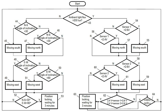 - The control unit of the MLD sensor [56,57] performs continuous sun tracking from sunrise to sunset and strives to maximize the energy yield. As a result, in the case of heterogeneous light conditions, e.g., cloudy skies, the search for the brightest point in the sky becomes constant, thus increasing the likelihood of the unnecessary swaying motion of the motors. So, in heterogeneous light conditions, this system also has the problems seen above: unnecessary motor operation and increased wear. A favorable feature of the solution is that the sunrise position is set with the help of a sensor at dawn.