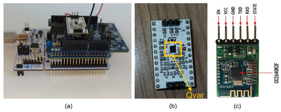 (a) The Nucleo L476RG + IKS01A1, (b) the ST-Qvar board, and (c) the Bluetooth module.