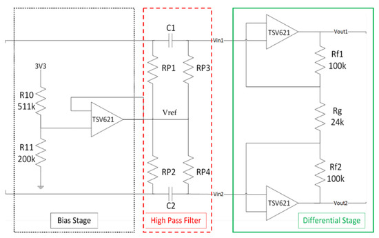 Given the low amplitude of biopotentials, we had to design a proper front-end to amplify the signals before feeding them to the ST-Qvar. The chosen architecture for the pre-amplifier circuit is shown in Figure 2. The circuit is divided into three stages: the bias stage, highlighted with a black dotted outline, the high-pass filter stage, highlighted with a red dashed outline, and the differential stage, highlighted with a green continuous outline.