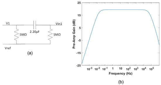 In addition to the bias stage, we introduced a high-pass filter, shown in Figure 2 and detailed in Figure 3. This filter is necessary to eliminate DC and electrodes offset. Our first design criterion was to provide a high-input impedance to the pre-amp stage, thus allowing the system to properly read the signals of interest. We experimentally verified that a resistor of 5 MΩ is high enough to achieve this requirement. Second, we had to choose a capacitance value to ensure a cutoff frequency well below the lower bound of our useful bandwidth (around 0.5 Hz; see, for example, [33]). Consequently, we adopted a capacitor of 2.20 μF, obtaining a cut-off frequency fp1 of 14.4 mHz. Finally, LT-Spice simulations highlighted that the second pole frequency fp2 falls well beyond the bandwidth upper limit, as shown in Figure 3b.