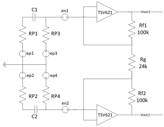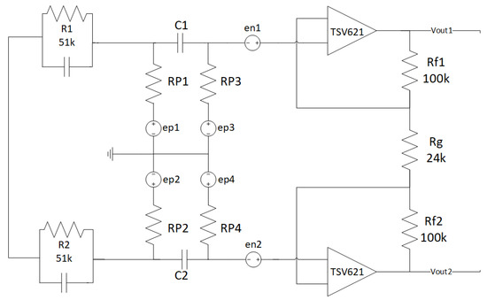 One of the main problems in this kind of system is the high impedance of the skin, which worsens when using dry electrodes, adopted in many commercial devices. That is why, in our tests, we used wet electrodes, although they are less comfortable. In this case, the impedance mismatch of the two electrodes is a much bigger problem and, for this reason, we perform noise simulations. Anyway, with our current scenario being mostly static (as, for example, sleep monitoring), dry electrodes would be particularly disadvantaging since they could not benefit of increased conductivity due to sweating, as happens for sport-targeted devices. It is clear how the high-value resistors (used to realize the body polarization) and the op-amps represent the main noise sources. That is why, in the following, we only consider those two sources. For the noise analysis, we replaced each resistor of the designed front-end (Figure 2) with its equivalent noise model.