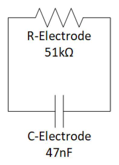 We consider the equivalent electrode skin impedance Zep established by the standard IEC 60601-2-47 that concerns the basic safety and essential performance of ambulatory electrocardiographic systems [34]. In this case, disabling the two inputs is equivalent to short-circuiting the input terminals. Thus, the simulation is developed by modeling the electrode–skin impedance as the parallel of one 51 kΩ resistor and one 47 nF capacitor, as shown in Figure 6. Case 2 (Zep = 0) is shown in Figure 7.