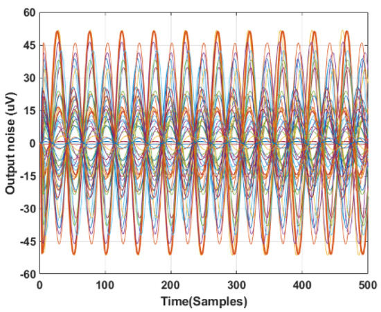 Finally, in a specific circumstance where the battery is not available, a cabled power supply is viable. In this case, it is worth providing some information on the common-mode noise introduced by the components (electrodes included) mismatching. A common-mode signal, with an amplitude of 1 V and a frequency of 50 Hz, has been sent to the inputs of the pre-amplification circuit (the differential signal is not considered for this analysis). Considering the balanced circuit in Figure 2, the common-mode output is massively reduced, with an Acm of −300 dB (as shown in Figure 4b). It is important to understand which values of the passive components lead to an increase in the common-mode output. We used the Monte Carlo method to evaluate the common-mode output, considering various combinations of all the passive components. We performed simulations with LT Spice 17.0.32.0, considering a tolerance in the maximum range of 1% for the passive components. Results are shown in Figure 8, where different colors indicate different combinations of resistance and capacitor values in that range. The worst case of the simulation shows a peak-to-peak amplitude of 100 μV.