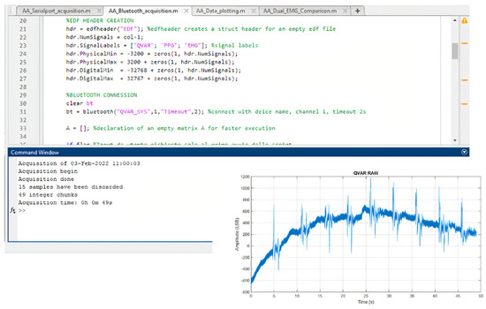 The transmitter unit is connected via BLE to a laptop running Matlab with BLE toolbox, which acts as the receiver unit. The BLE toolbox allows reading an incoming Bluetooth transmission by setting a virtual COM port and treating the Bluetooth link as a standard serial transmission. In this way, data incoming from the ST-Qvar sensors are received in real time and automatically saved at the end of the recording. Date, time, recording duration, and the number of acquired samples are saved. Matlab waits for the Bluetooth pairing between the HM-19 and the laptop, then starts acquiring data from the Bluetooth virtual COM port. The Matlab interface is shown in Figure 9.