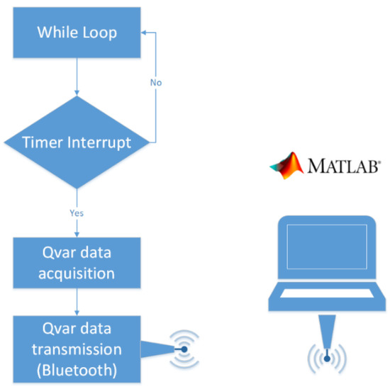In our prototype, ST-Qvar acquisition is handled by the Cortex M0 microcontroller embedded on the Nucleo L053R8 board. We wrote the firmware with Keil μVision V5 software. Our first criterion was to acquire signals at the maximum sampling frequency of the ST-Qvar (240 Hz). Second, we wanted to acquire through an interrupt routine. As a last criterion, our interrupt had to be triggered by a timer. Figure 10 shows the logical scheme of the implemented firmware. On each timer tick, the microcontroller acquires the charge value via I2C from the ST-Qvar and sends it to the Bluetooth transmitter via serial port. The timer is set to tick at 240 Hz. The BLE transmits the data directly to a laptop running Matlab.