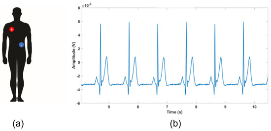 Concerning the ST-Qvar setup in the ECG signal, we used a single-lead ECG to estimate the heart frequency through the detection of the R-peaks and the evaluation of RR intervals. More in detail, we adopted a lead D1 configuration implying the positive and negative electrodes placed on the left and right upper extremities, respectively. For each subject, we positioned wet commercial Ag/Cl electrodes in RA-LL configuration, as shown in Figure 11a [35,36]. The acquired raw ECG trace from one of the candidates is displayed in Figure 11b.