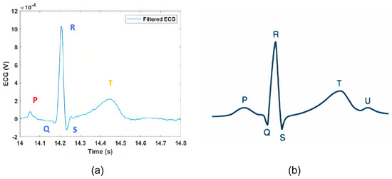 A single ECG oscillation from Figure 11 is zoomed-in in Figure 12a, where it is possible to recognize all the typical features of ECG, namely, the P wave, the QRS peak, and the T wave [37]. For comparison, a typical ECG waveform is shown in Figure 12b [38]. Figure 12. Table 1 reports the obtained mean values for the main ECG features, calculated from the five-subjects population.
