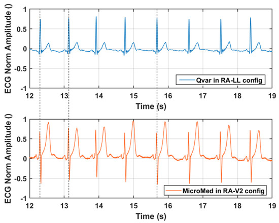 In conclusion, in Figure 13 we report a fraction of a simultaneous two minutes’ acquisition of ECG signal performed by Qvar and MicroMed systems. In multi-channel ECG acquisitions, different electrodes locations change the morphology of the ECG waveform, but the R-peak period, and thus the RR interval, does not depend on the chosen derivation. This happens because heart rate measurement comes from RR interval and must be derivation independent. To prove the robustness of our sensing technique, also taking this into account, we kept the configuration from Figure 11a for the ST-Qvar system and adopted a different one for the gold standard. In particular, we placed the MicroMed electrodes in RA-V2 configuration [36].