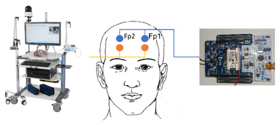 Under the supervision of neurologists, a single subject underwent an acquisition of frontal single-channel EEG with ST-Qvar and the MicroMed Medical device (again considered as our gold standard) simultaneously. Following the 10–20 International System guidelines, we placed the electrodes in locations Fp1–Fp2, as shown in Figure 14. The electrodes of the MicroMed and the electrodes of the ST-Qvar were not overlapped but were as close as possible to each other. With this setup, we asked the subject to simply keep their eyes closed for few seconds to record EEG activity.