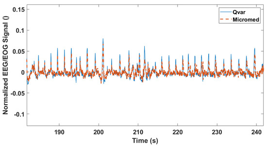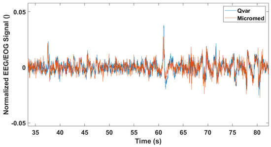 This test served as a general indication of the ST-Qvar’s ability to record a comparable signal with respect to the gold standard. With this being a single channel acquisition from Fp1–Fp2 electrodes, the only analysis performed is a time domain comparison. Results are shown in Figure 15, where we report only a fraction of the two raw signals. The two traces collected with ST-Qvar and MicroMed match significantly. The minimal amplitude difference is due to the slightly different positions of the electrodes in the two cases.